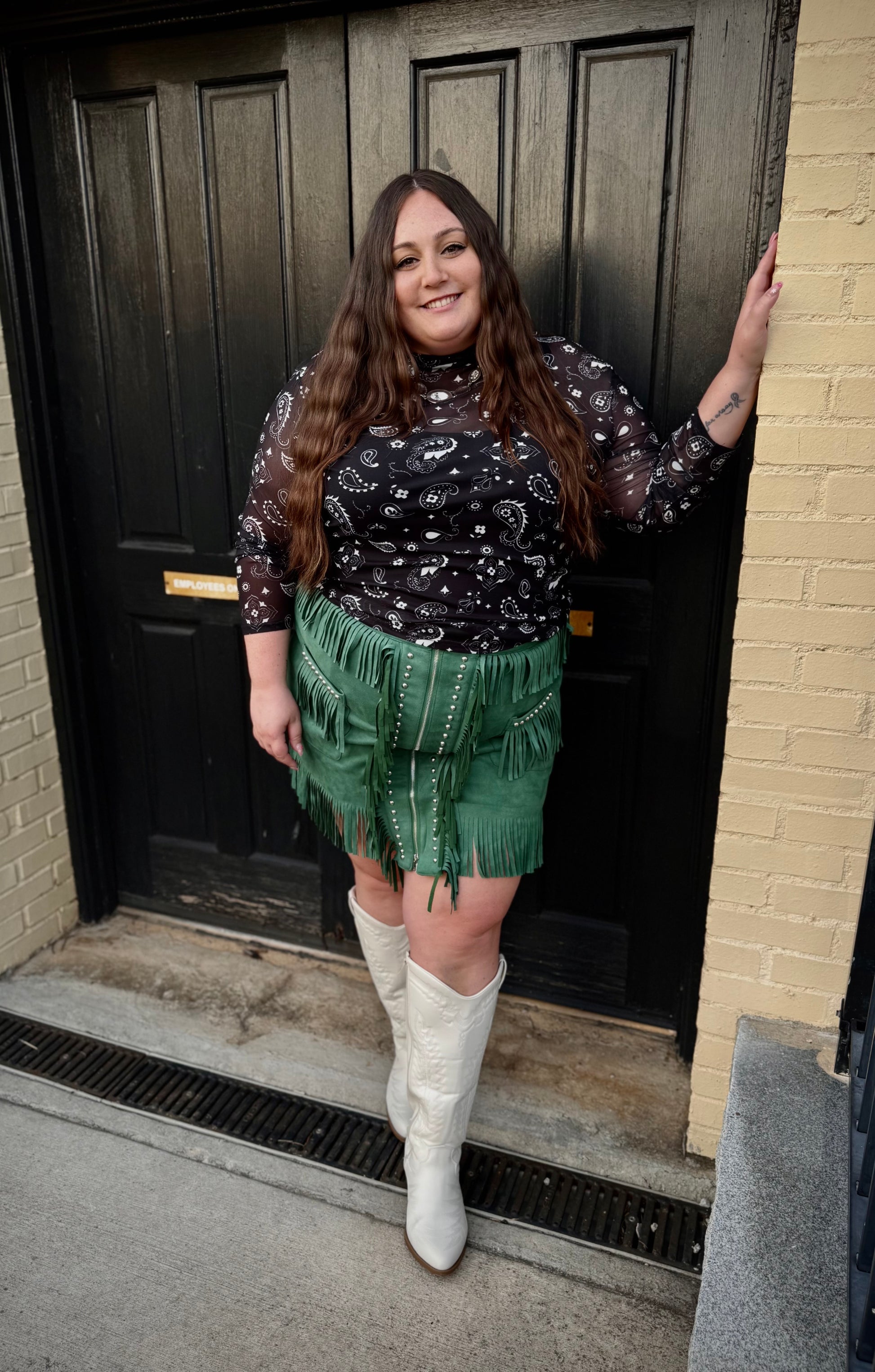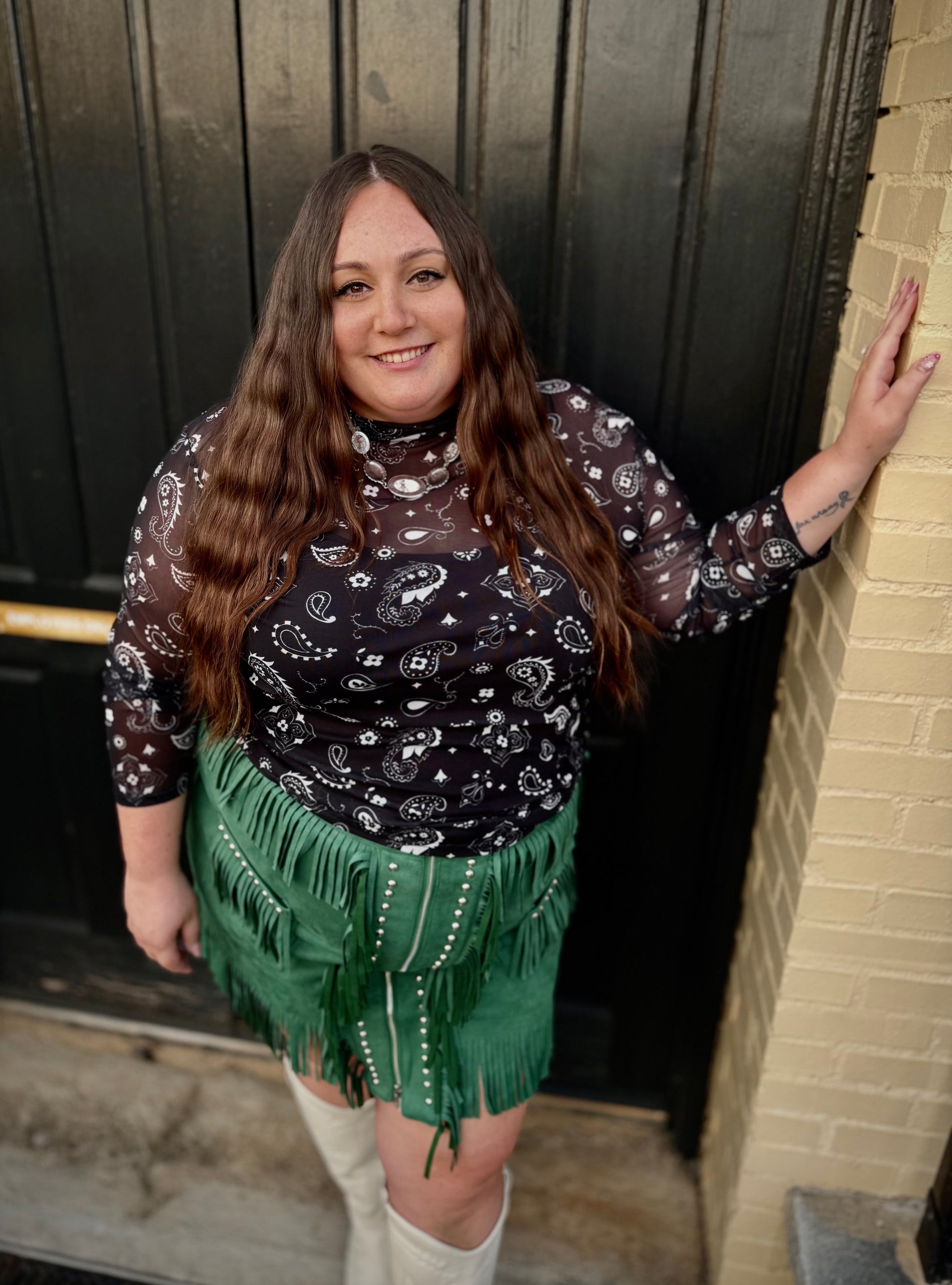 This cute and comfy top features a unique bandana pattern on stretchy black mesh. Perfect for adding a touch of edge to any outfit. Get ready to serve some looks.