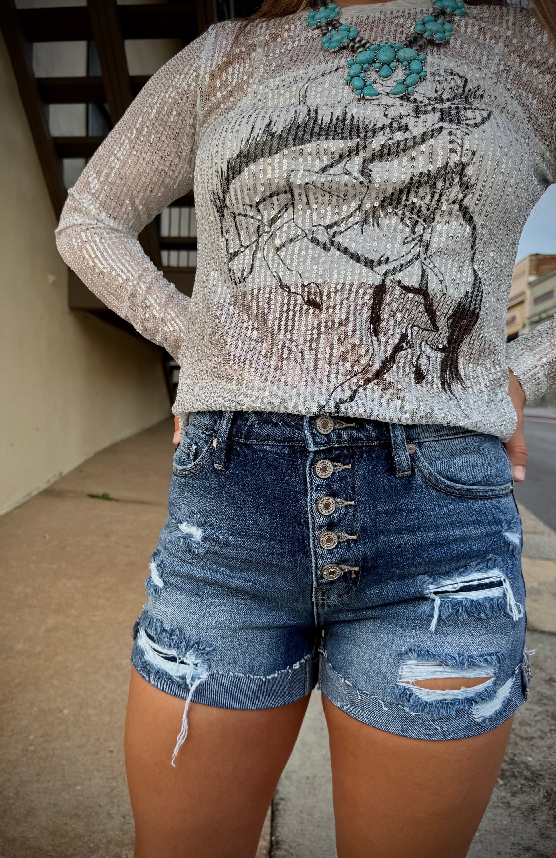 Plus Size high rise mended distressed denim shorts with singe cuff and button closure.