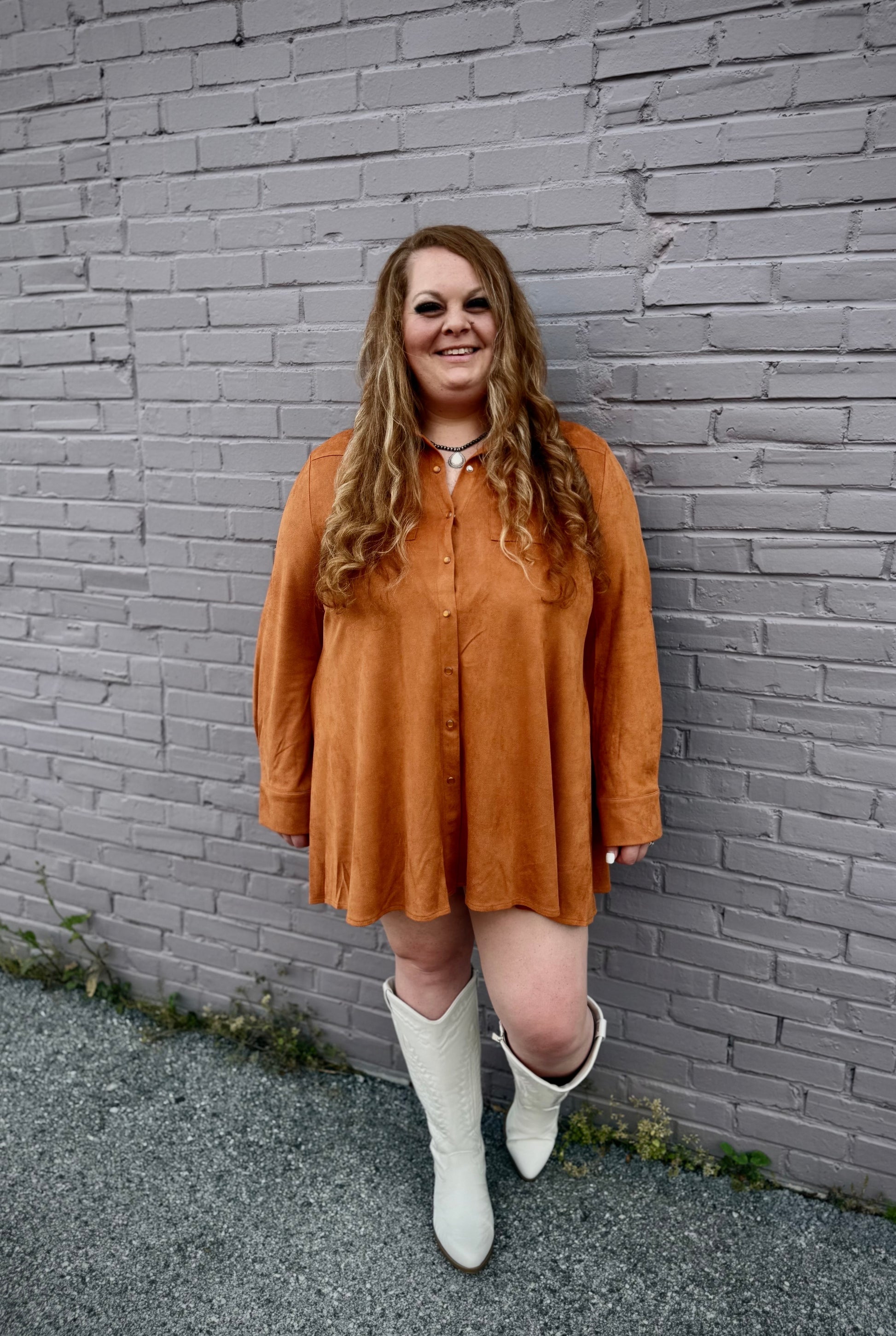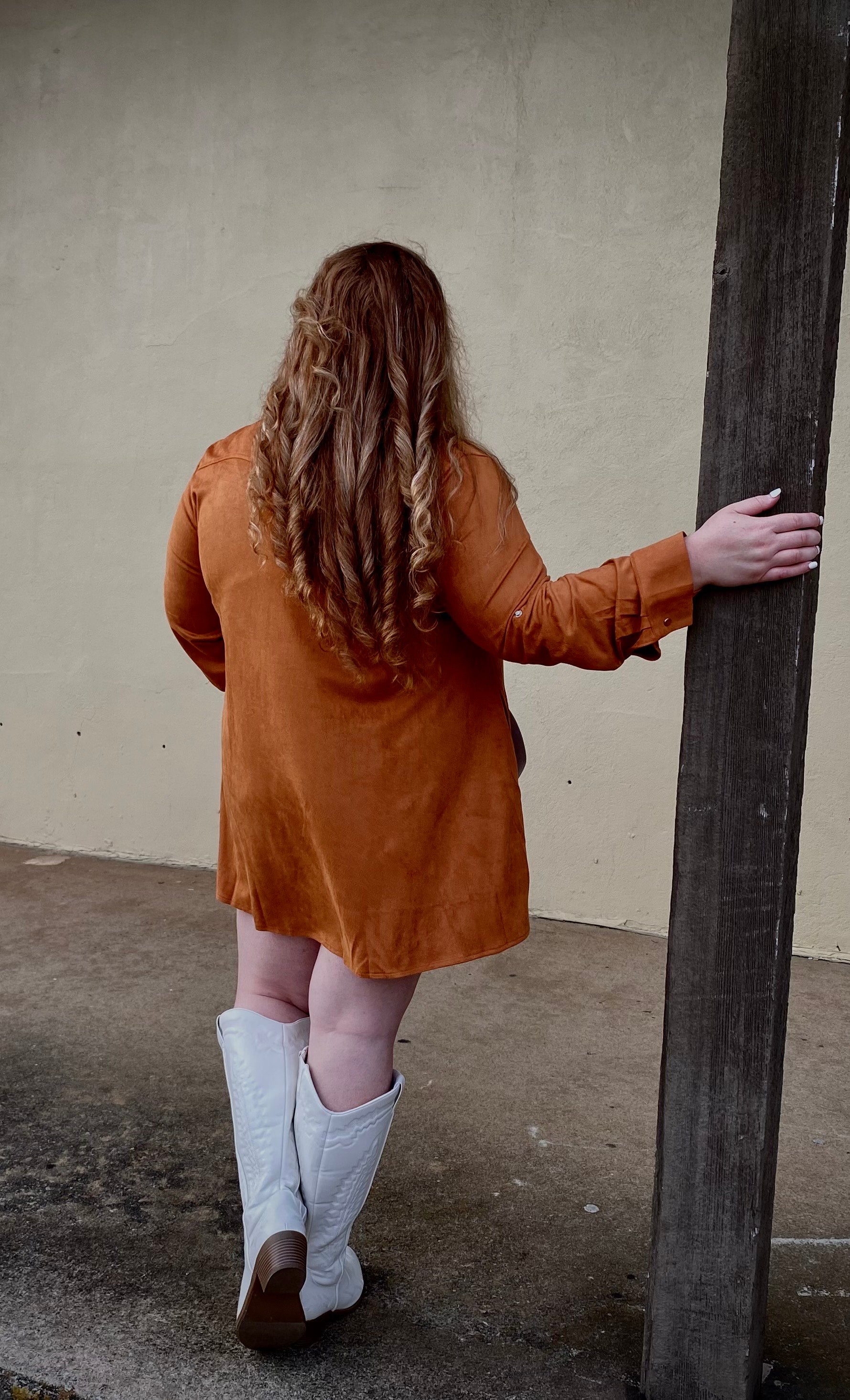 Plus Size Western Camel Suede Pearl Snap Button Down Dress