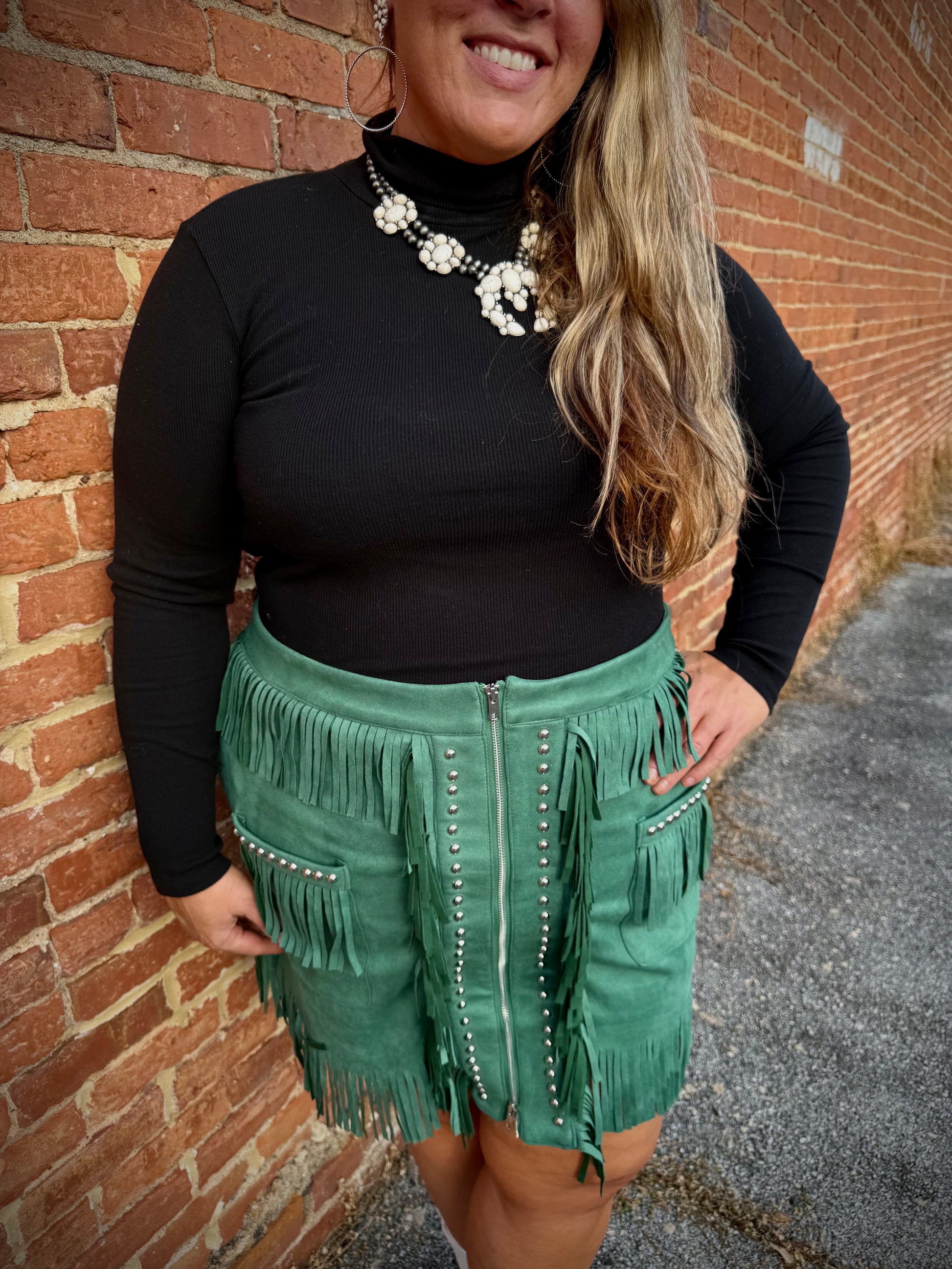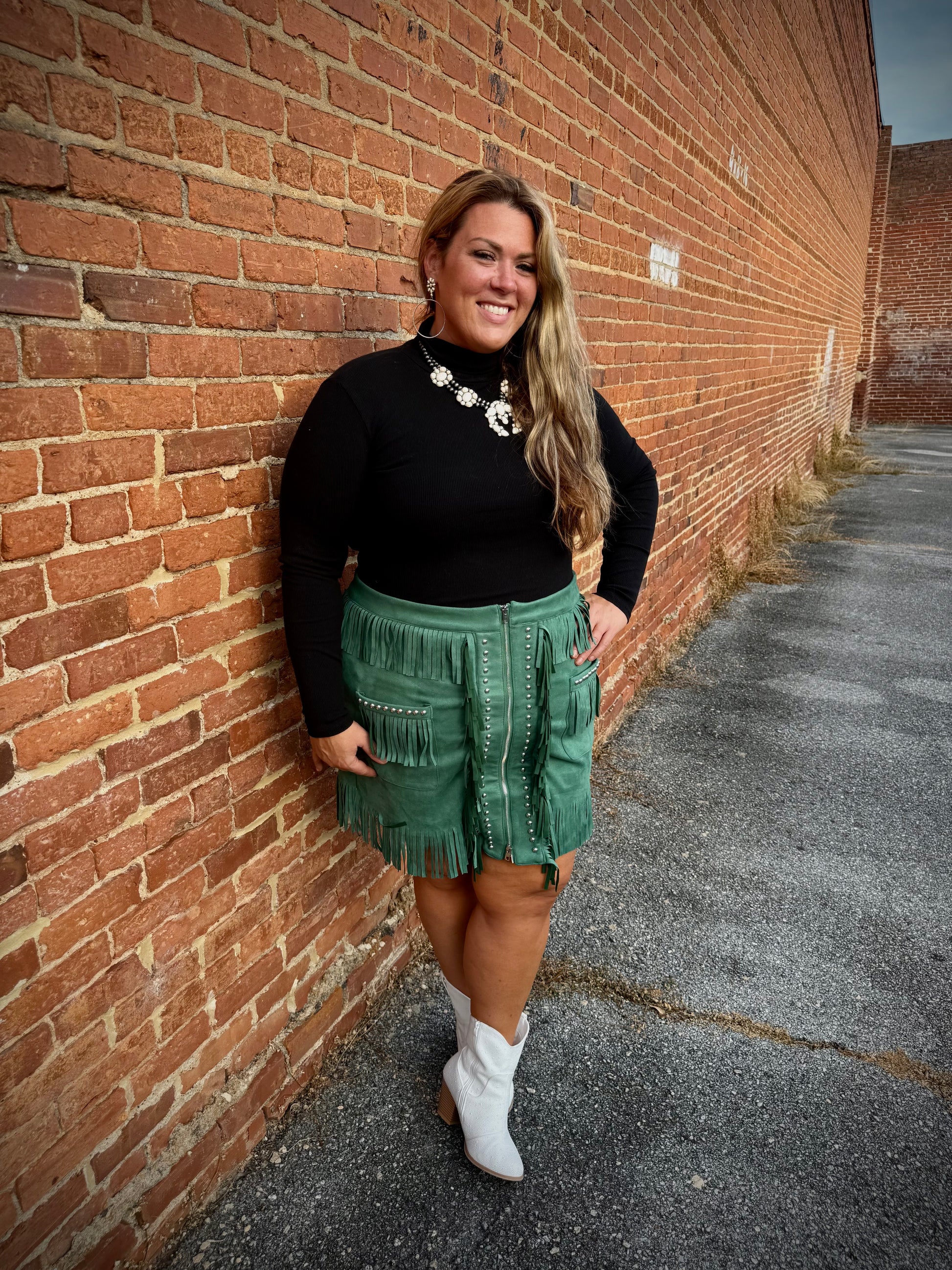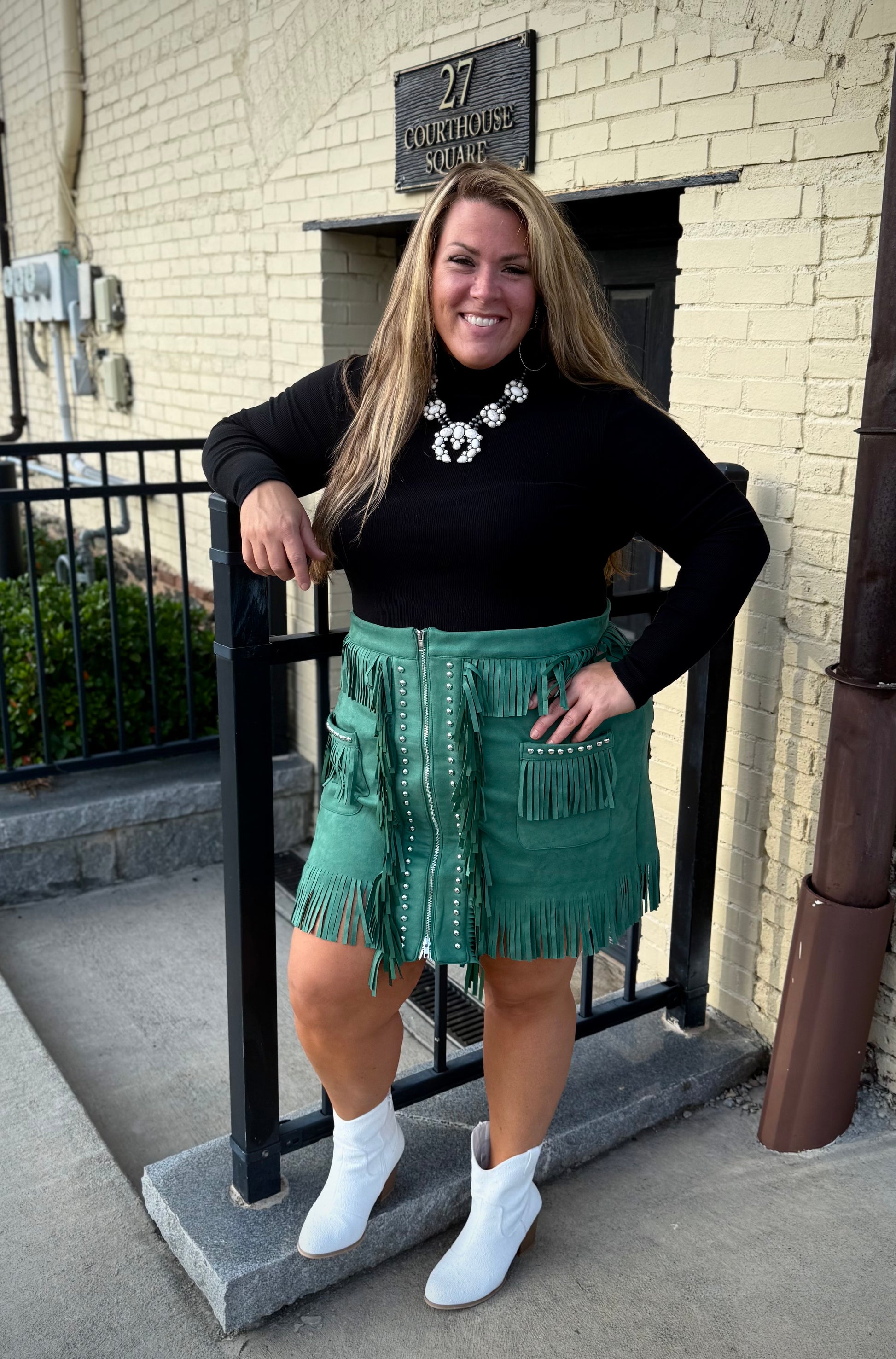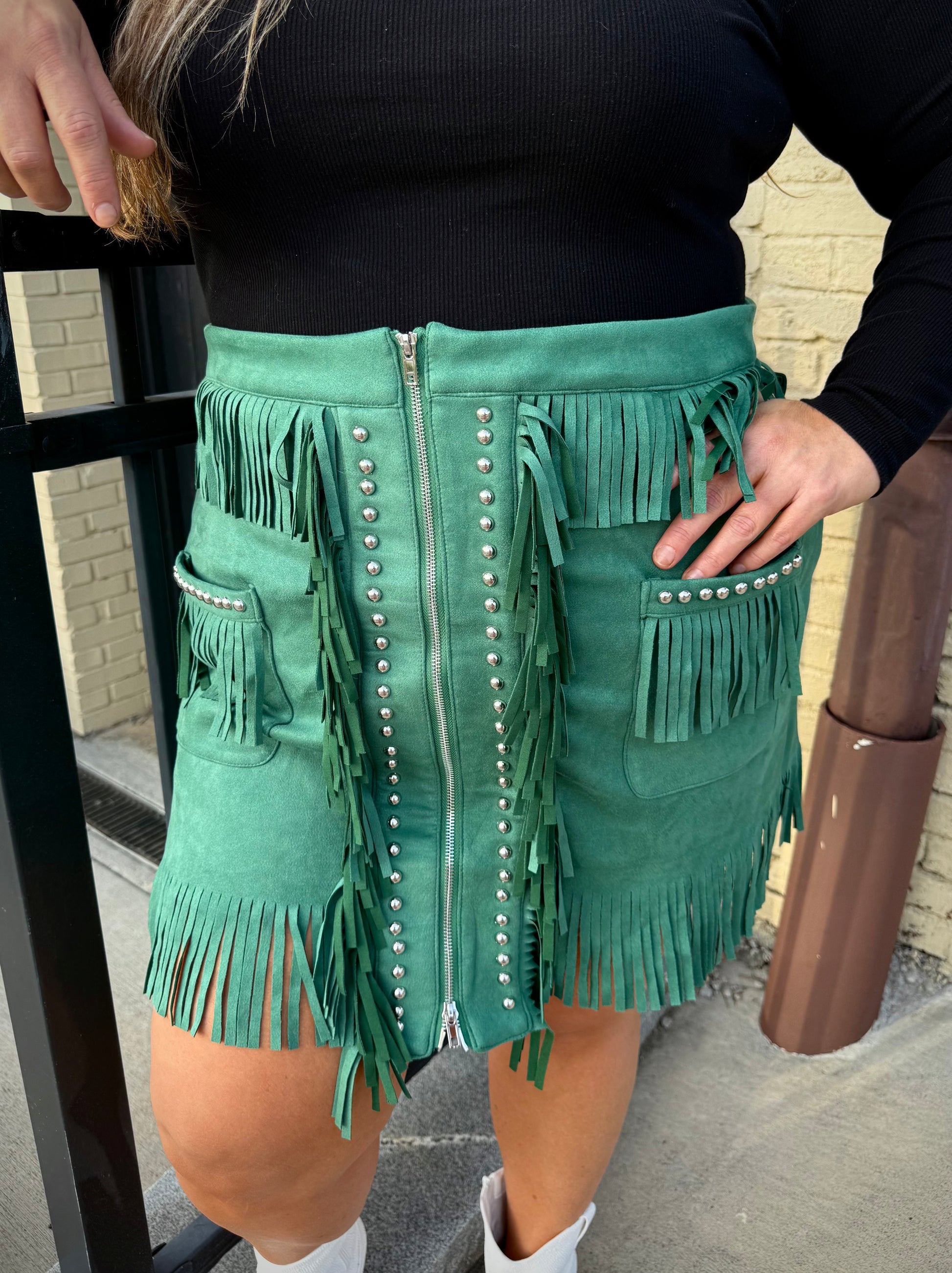 Plus Size Jade Suede Rodeo Zipper Studded Fringe Skirt