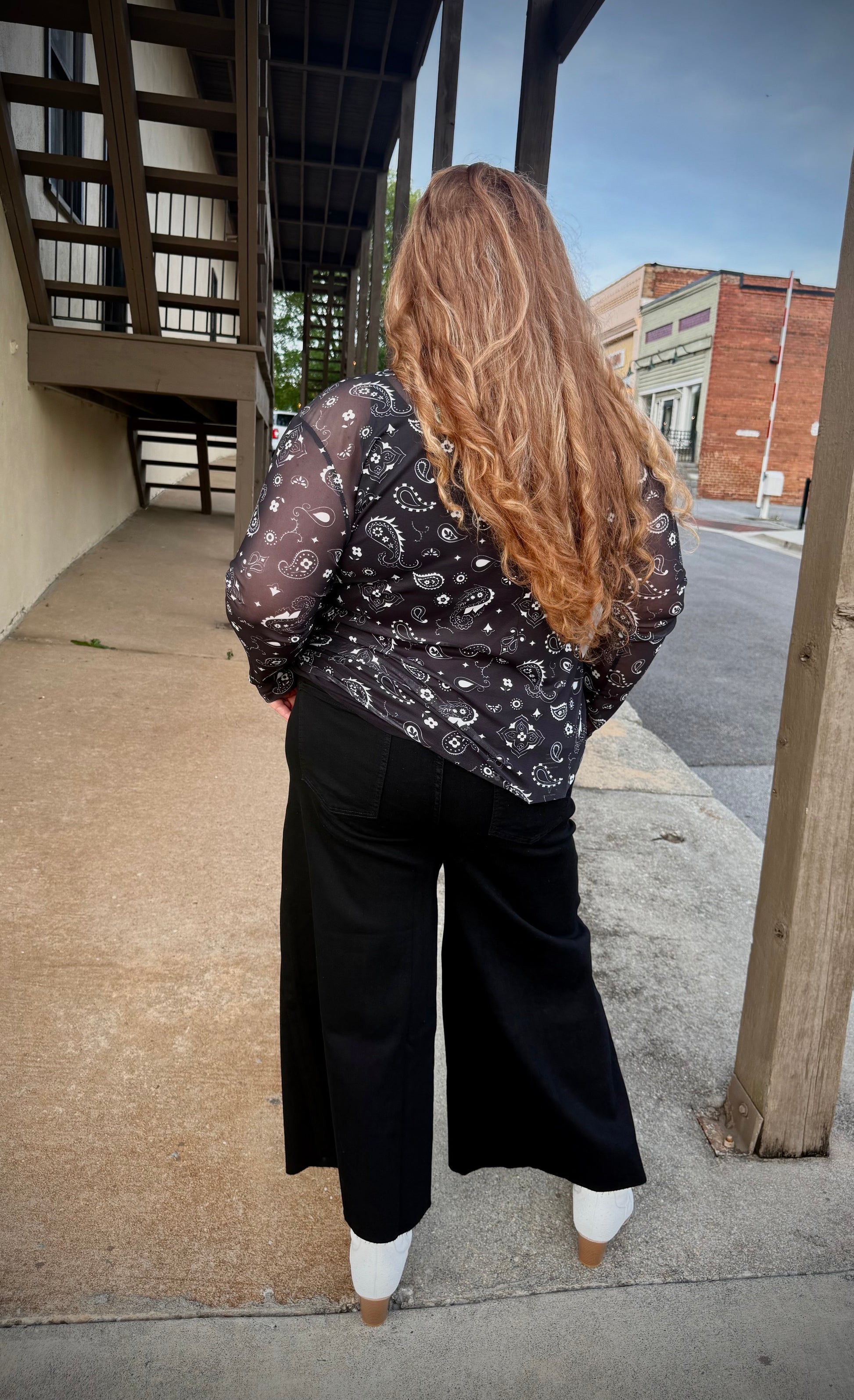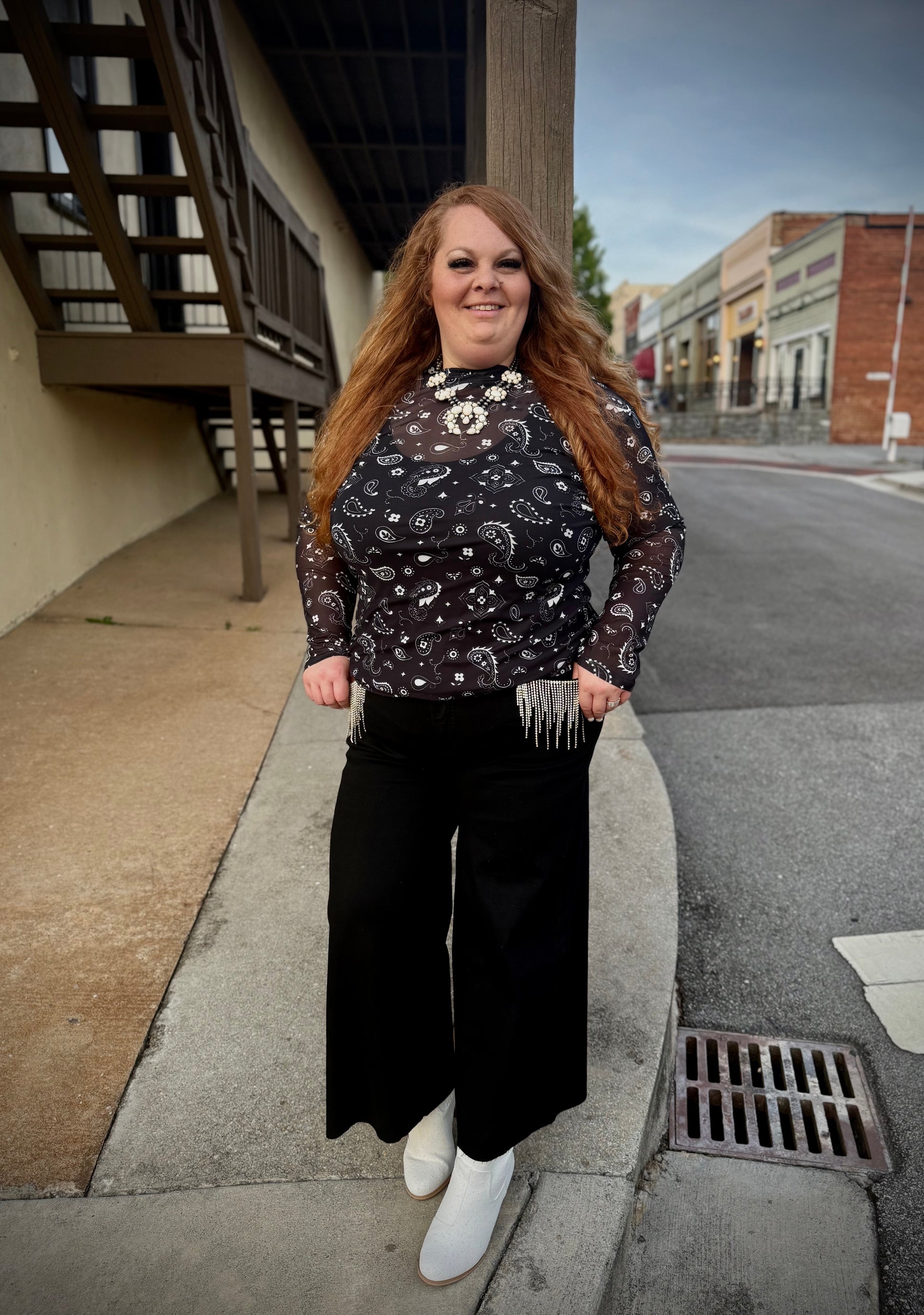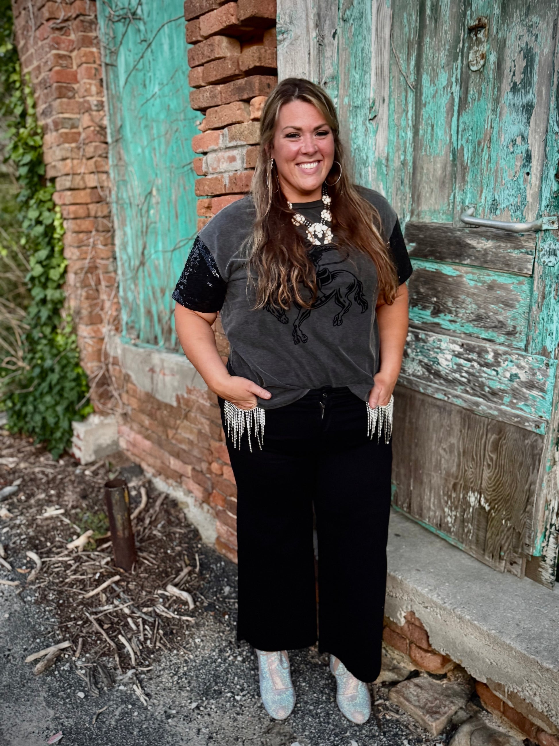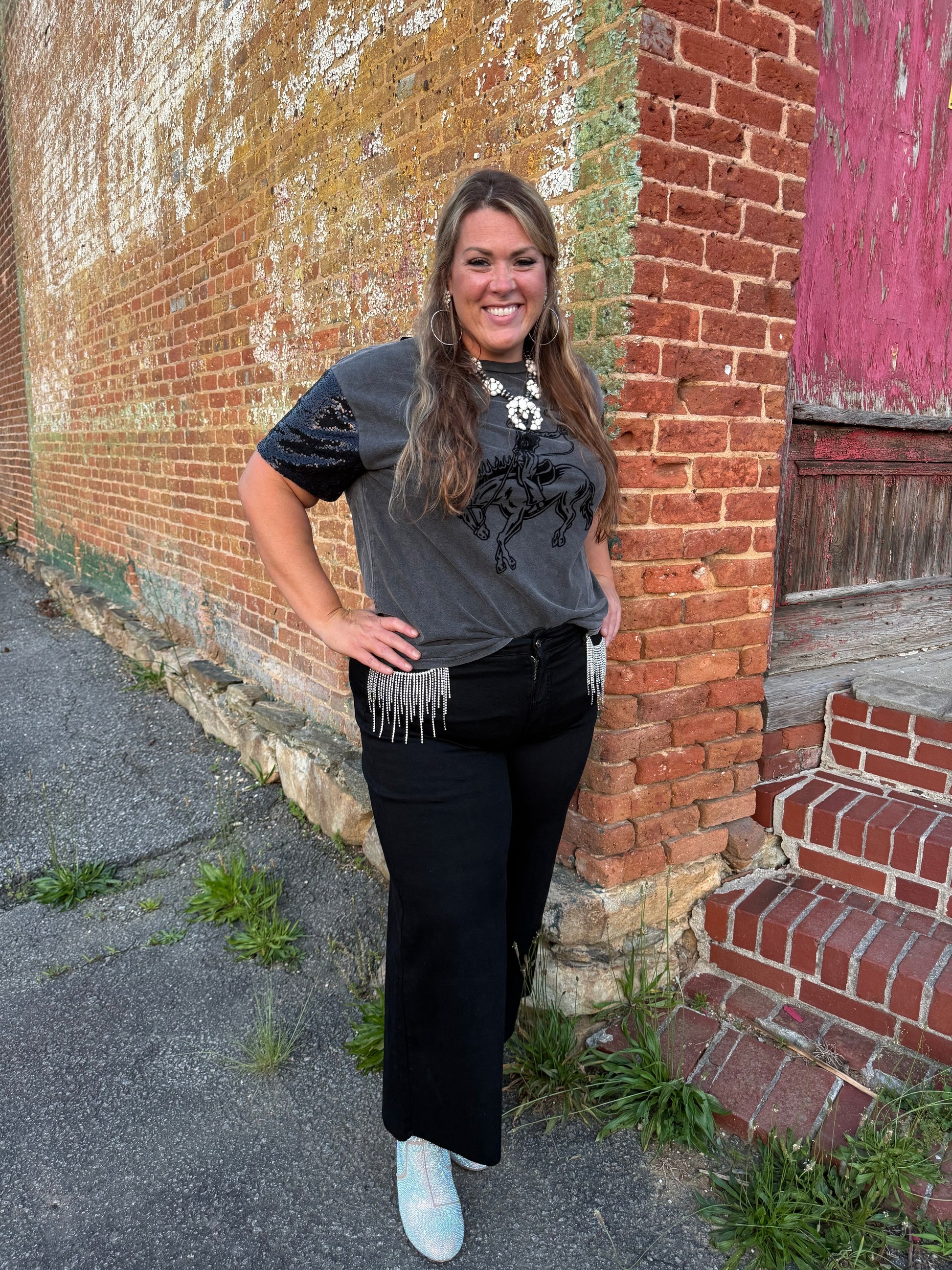 Pull off the denim and rhinestones with these high rise denim crop wide leg jeans with rhinestone fringe detail on the front pockets.