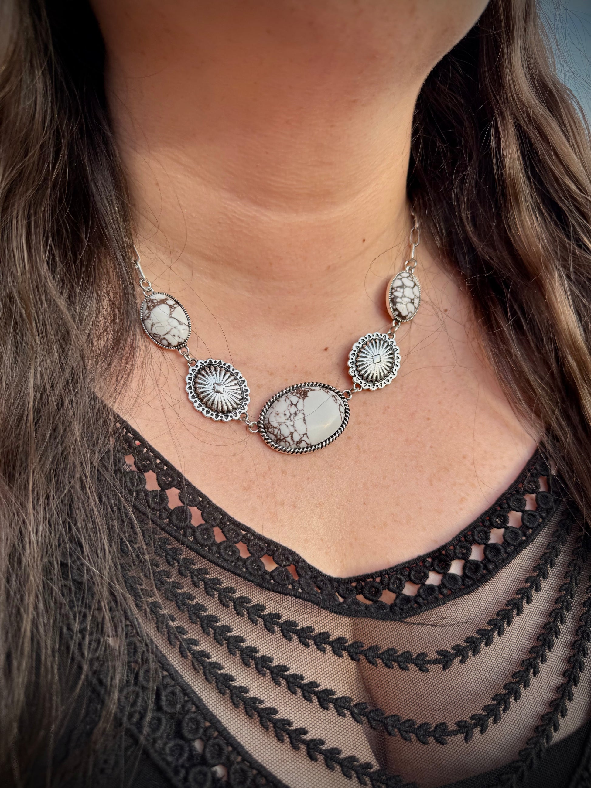 Add a touch of Southern charm to any outfit with the quirky Southern Dixie Necklace. Featuring 3 white marble stones and 2 silver conchos, this necklace will bring a touch of elegance and playfulness to your style. So go ahead, embrace your Southern roots and make a statement with this unique piece!