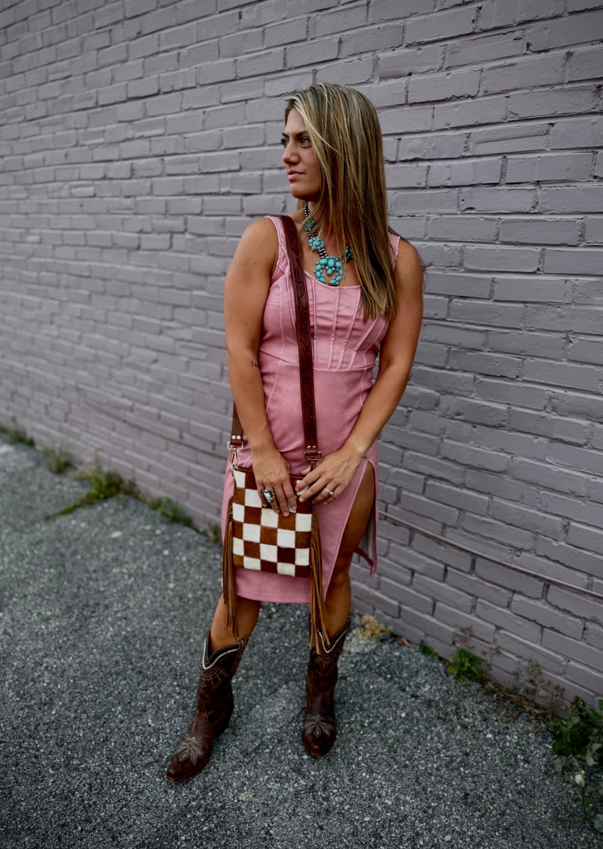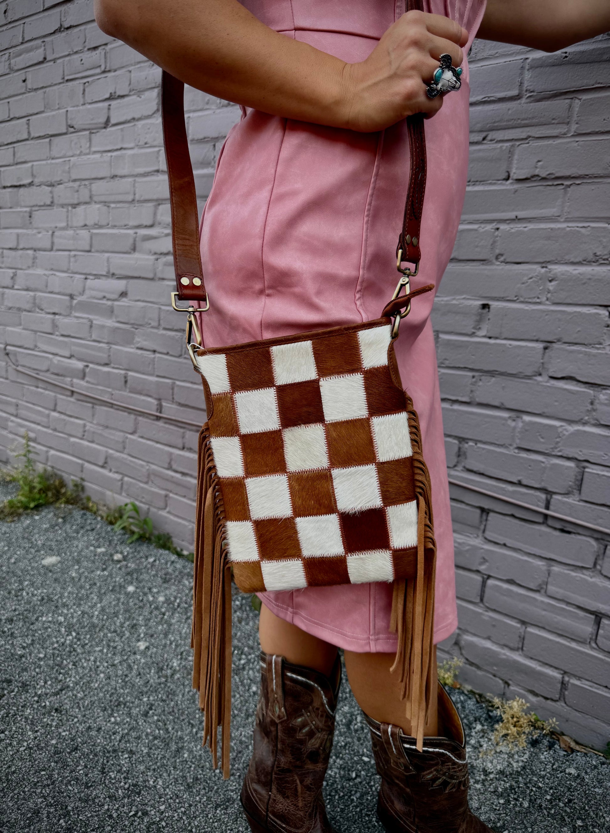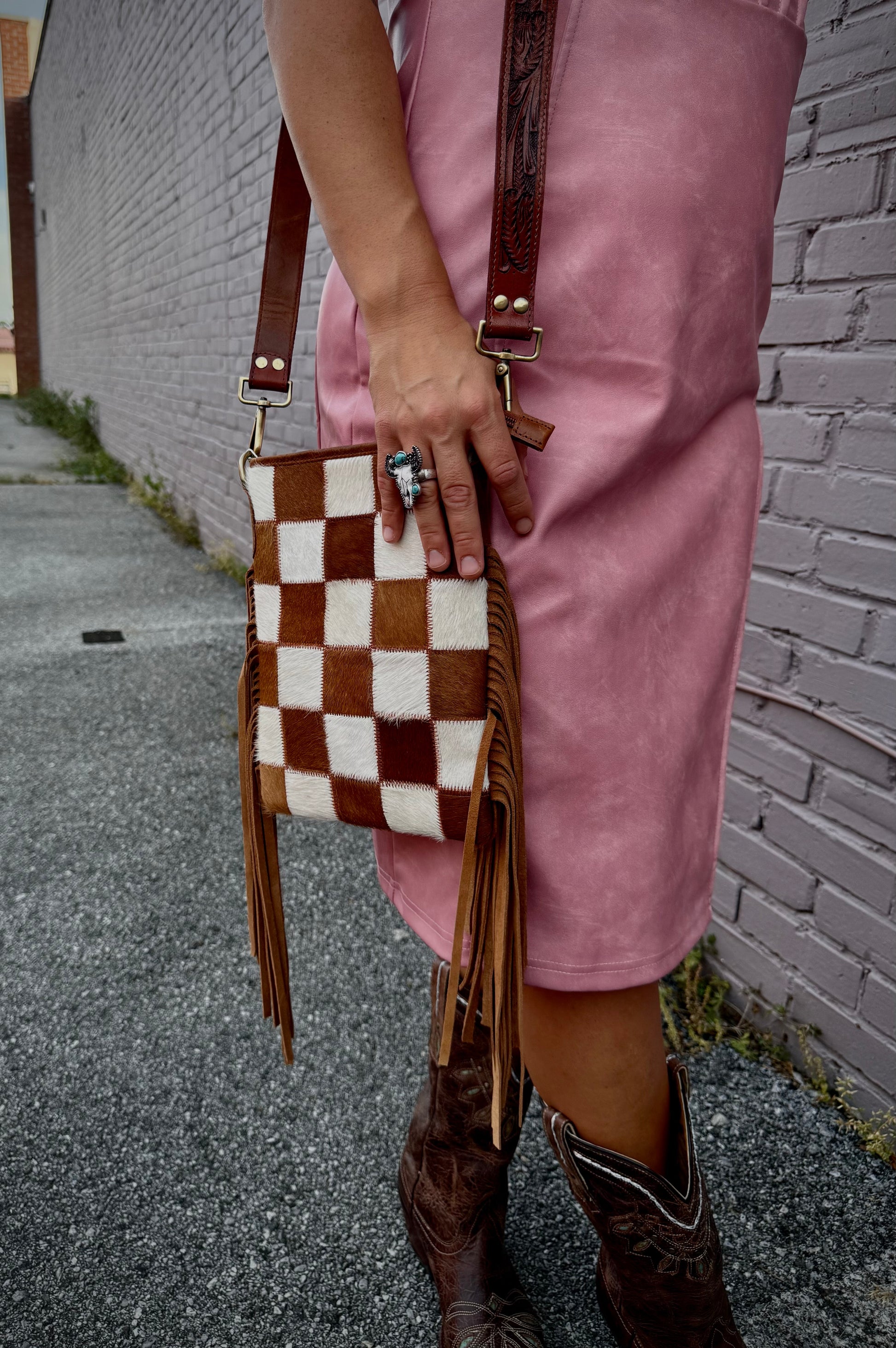 Expertly crafted western purse features a luxurious cowhide checkered front and a leather back for a unique and stylish look. The addition of suede fringe and a tooled leather strap add texture and depth, making it the perfect accessory for any outfit. It measures 10 inches by 8 inches and strap measures 50 inches. The back features a zipper pocket and inside also has a zippered side pocket.