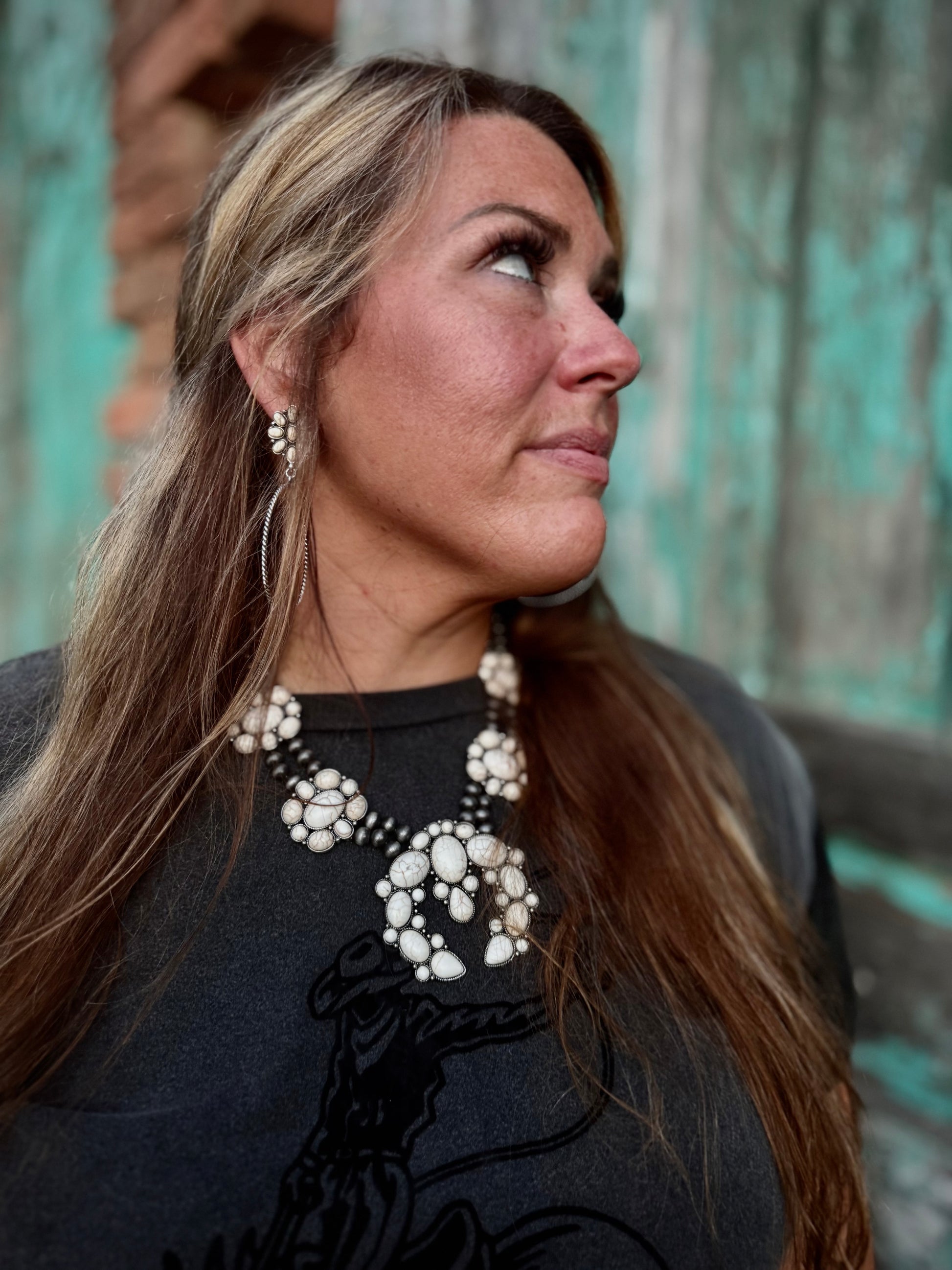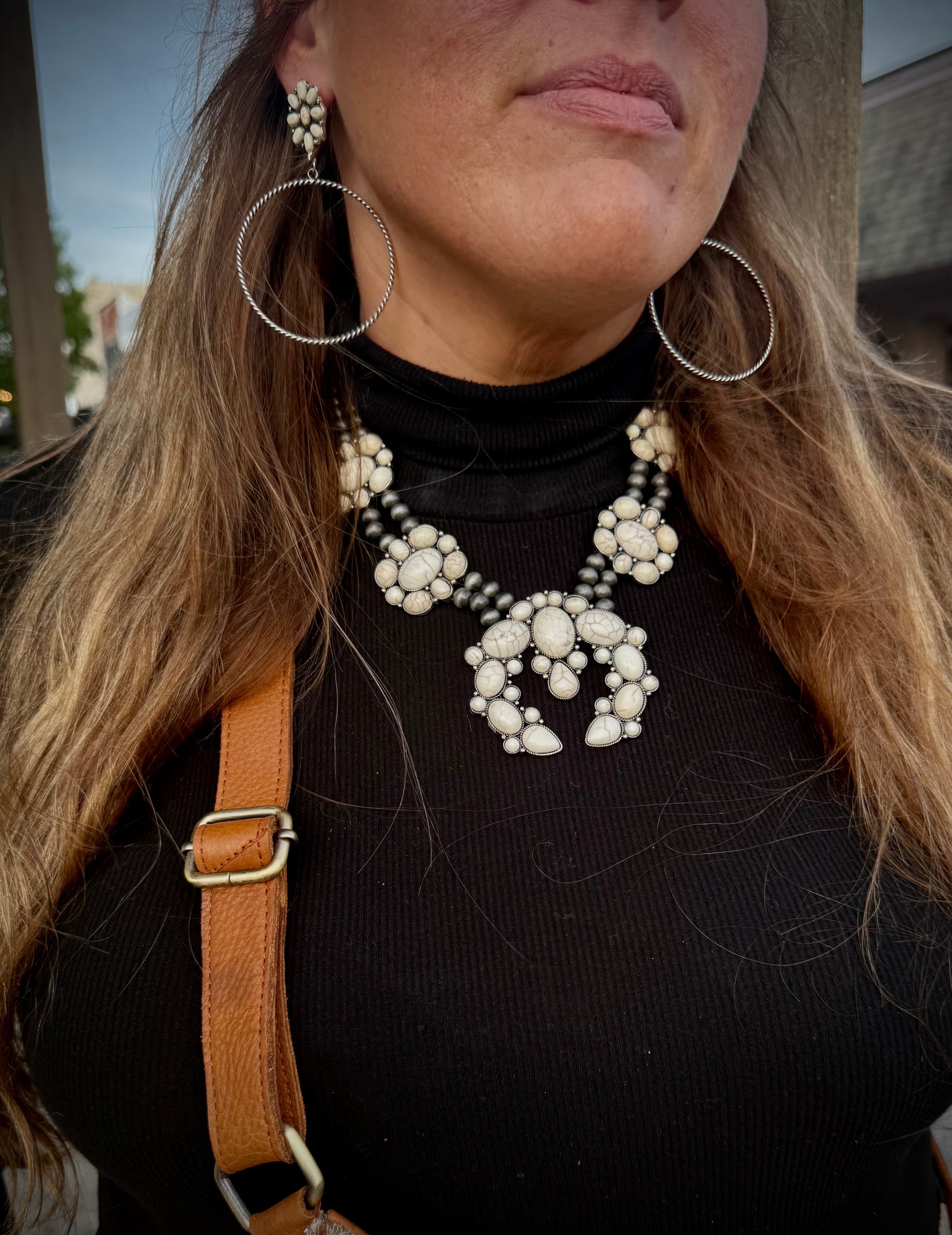 Make a statement with this Western Chunky Squash Blossom Necklace in Burnished Silver and White Color.